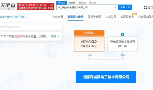 天眼查显示,成都海光微电子技术有限公司即海光微电子,AMD 持股 51%,海光信息持股 49%。也就是说,AMD 是海光微电子实控人。不仅如此,天眼查还显示,AMD 对海光集成北京、海光集成持股比例虽然只有 30%,但仍然是实控人。